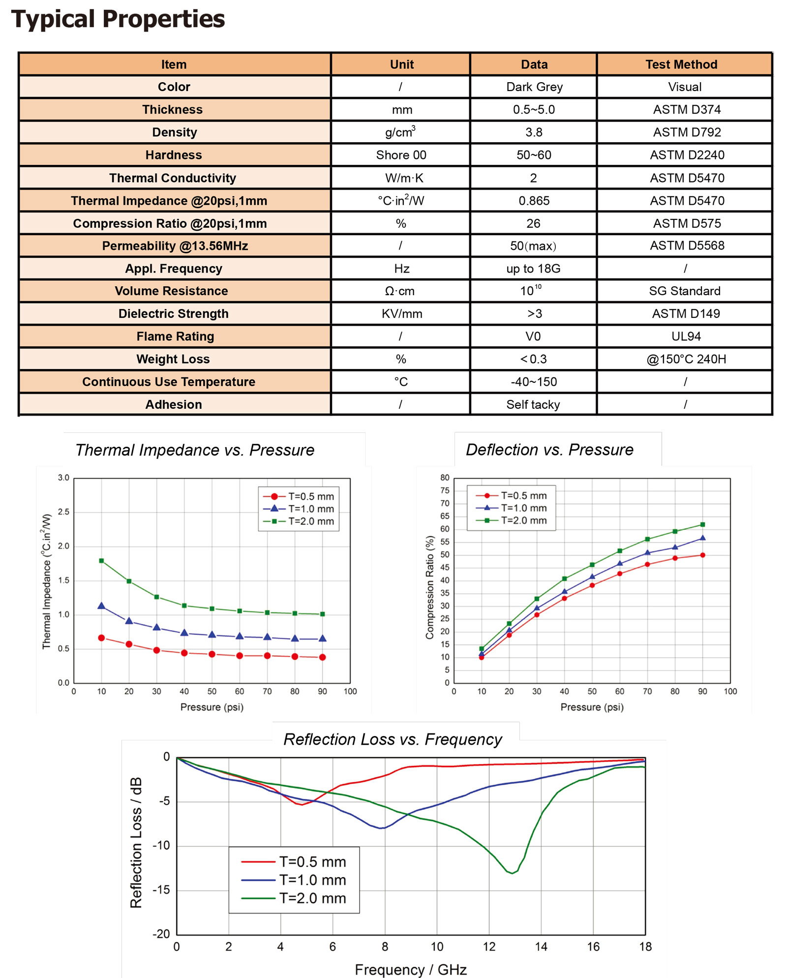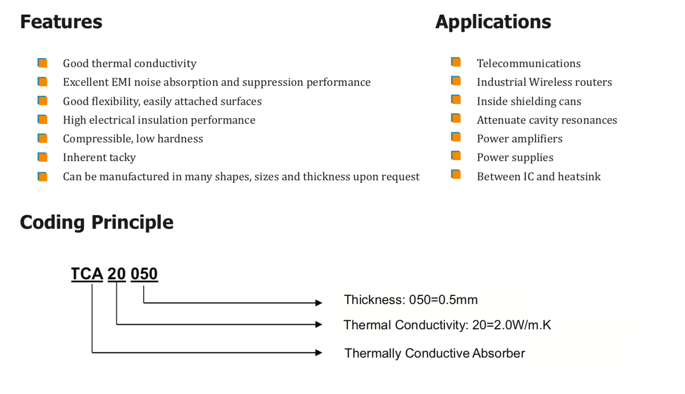 TM TCA系列導(dǎo)熱吸收材料是一種填充陶瓷和鐵氧體顆粒的硅基復(fù)合材料。設(shè)計用于吸收電磁噪聲(諧振腔、串?dāng)_和耦合)并填充熱界面之間的間隙。TCA系列吸收材料具有自粘性,組裝時不需要任何膠帶。" />