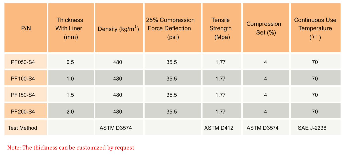 TM PF-S4 系列是一種穩固、快速回彈的泡沫,用于電子設備的緩沖、保護性密封和長期間隙填充。S4系列具有非常好的耐磨性、高密封性能和優異的沖擊吸收性能,可用作腳墊。" />