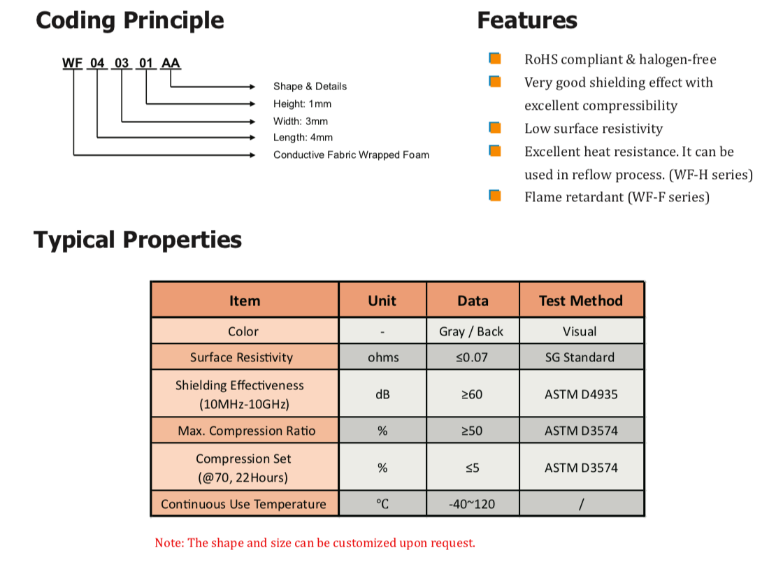 首頁 > 產(chǎn)品 > EMI/EMC 材料 > EMI屏蔽和接地墊片 > WF系列導(dǎo)電布包裹泡棉